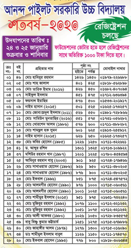 বুড়িচং আনন্দ পাইলট সরকারি উচ্চ বিদ্যালয়ের শতবর্ষ উদযাপন-২০২০ এর রেজিস্ট্রেশন অন-লাইনের পাশাপাশি ম্যানুয়াল ভাবে নির্ধারিত ফরম নিয়ে আমাদের টীম সদা-সক্রীয় রয়েছে। আপনি একজন গর্বিত আনন্দ পাইলটিয়ান্স হয়ে থাকলে উক্ত টীমের সদস্যদের সাথে যোগাযোগ করে সহজেই রেজিস্ট্রেশন সম্পন্ন করতে পারেন।