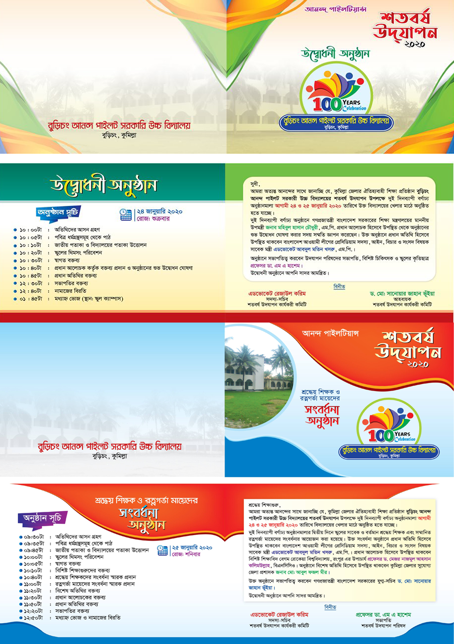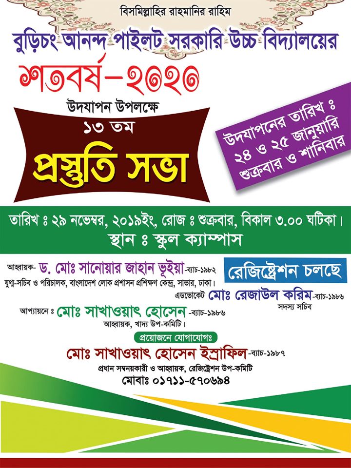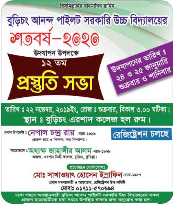 বুড়িচং আনন্দ পাইলট সরকারি উচ্চ বিদ্যালয়ের শতবর্ষ উদযাপন-২০২০ এর প্রস্তুতি আগামী ২২/১১/২০১৯ রোজ শুক্রবার বিকাল ৩:০০টায় বুড়িচং এরশাদ ডিগ্রী কলেজ হল রুমে অনুষ্ঠিত হবে আপনিও আমন্ত্রিত।